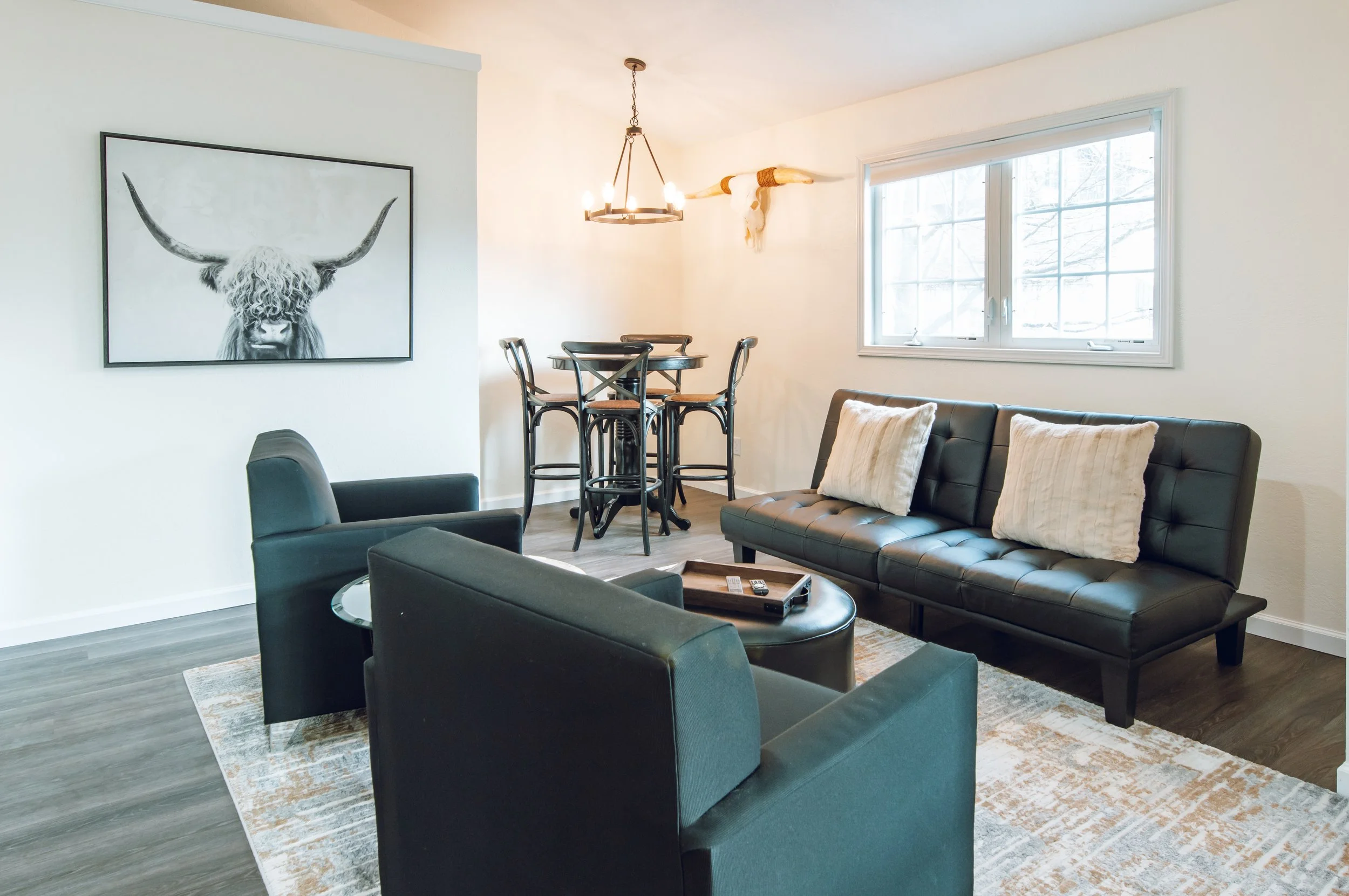 This second-floor unit includes an open living space with smart TV and comfy seating. In the same open space, there is a kitchenette complete with mini fridge, coffee maker, toaster and microwave. Off the living area is one queen bedroom, one king bedroom, and a freshly remodeled bathroom.