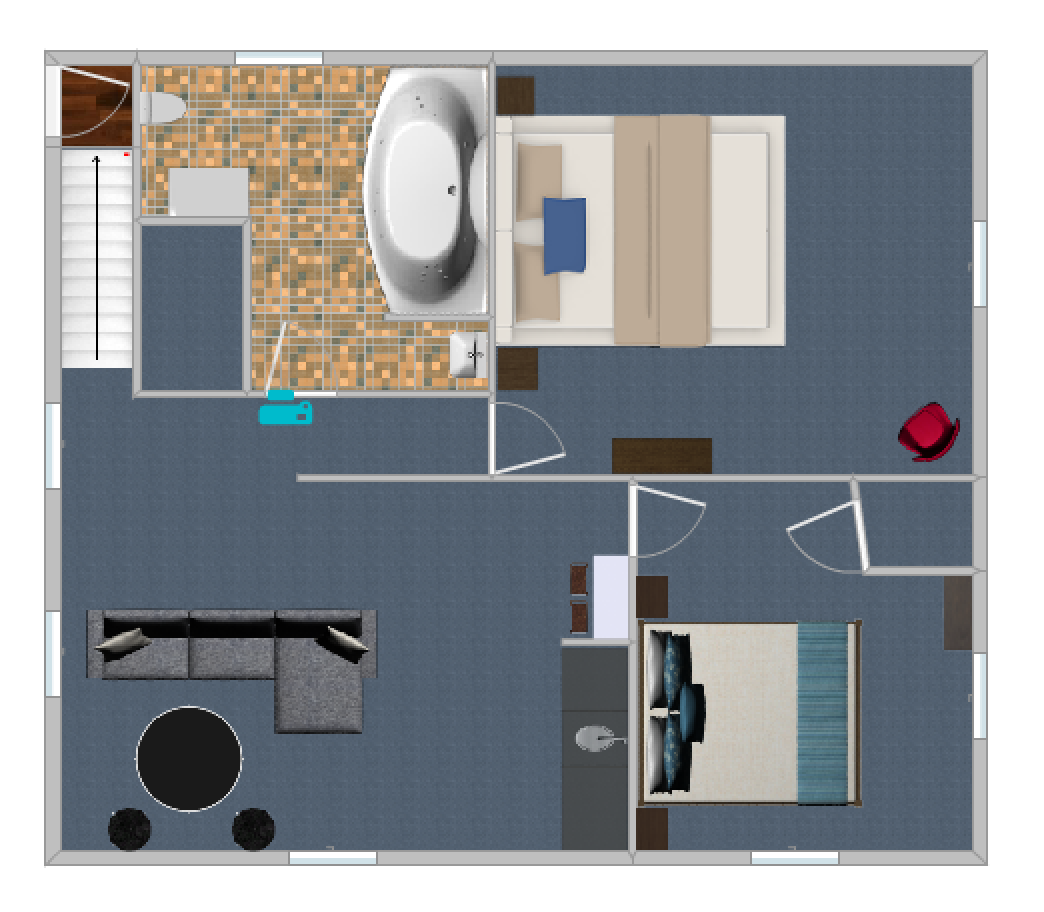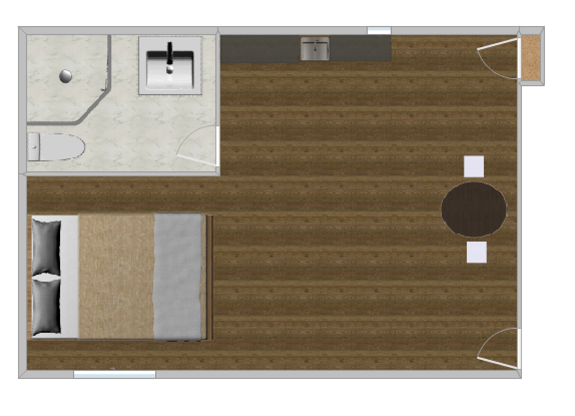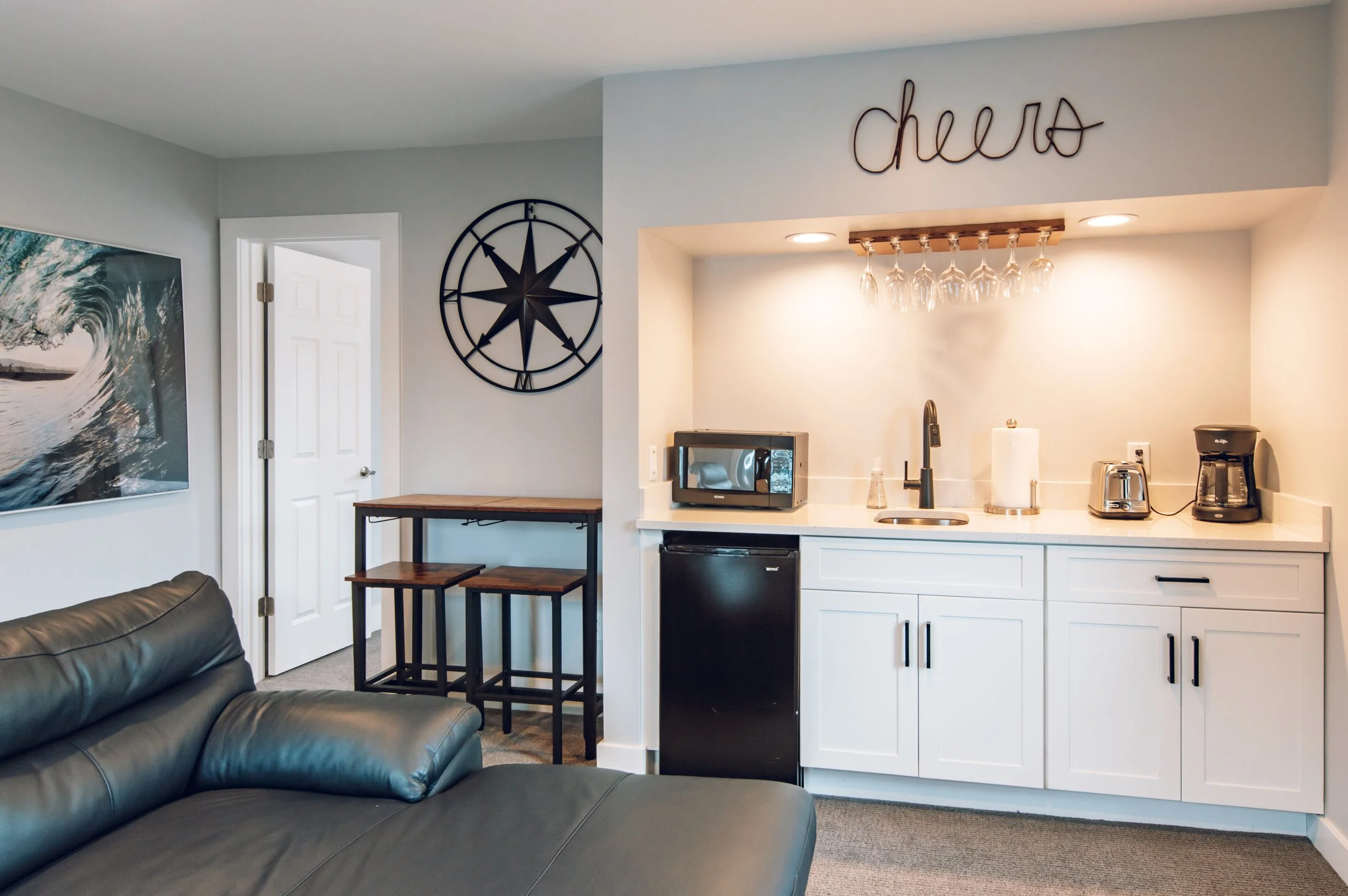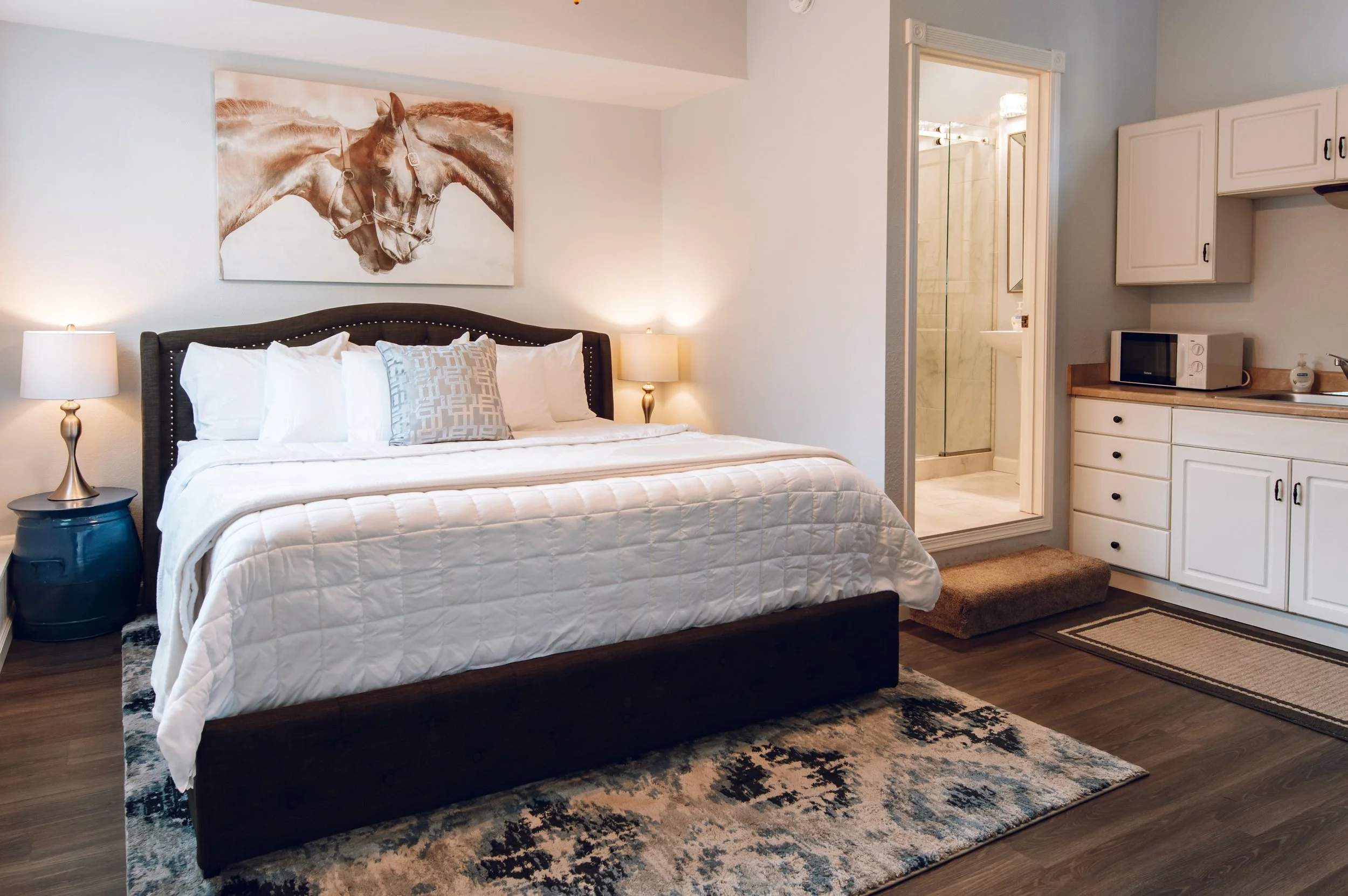 This space with a modern design, has an opening living concept, including a high top round table for four, and plenty of comfy seating to enjoy the smart TV, or electric fire place. In the same open space, there is a kitchette complete with mini fridge, coffee maker, toaster & microwave.