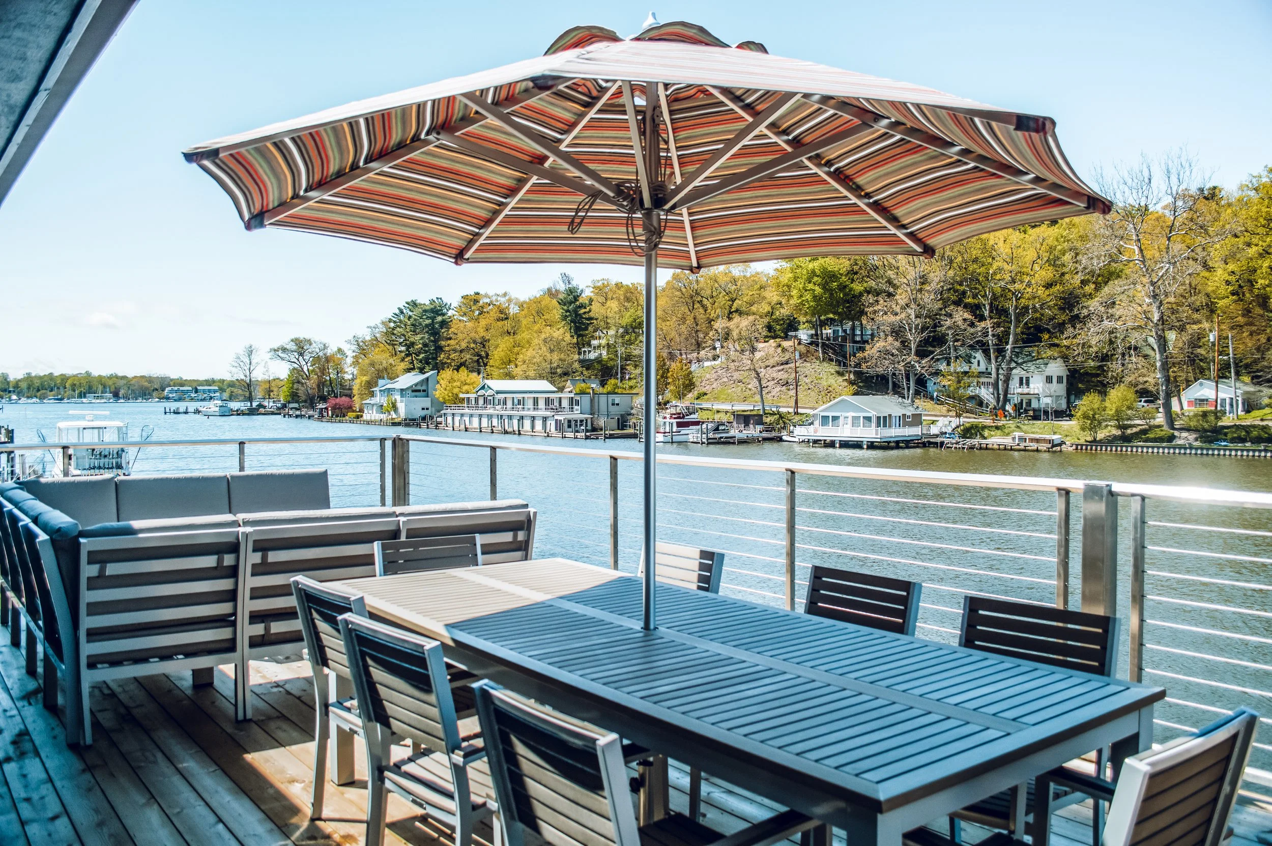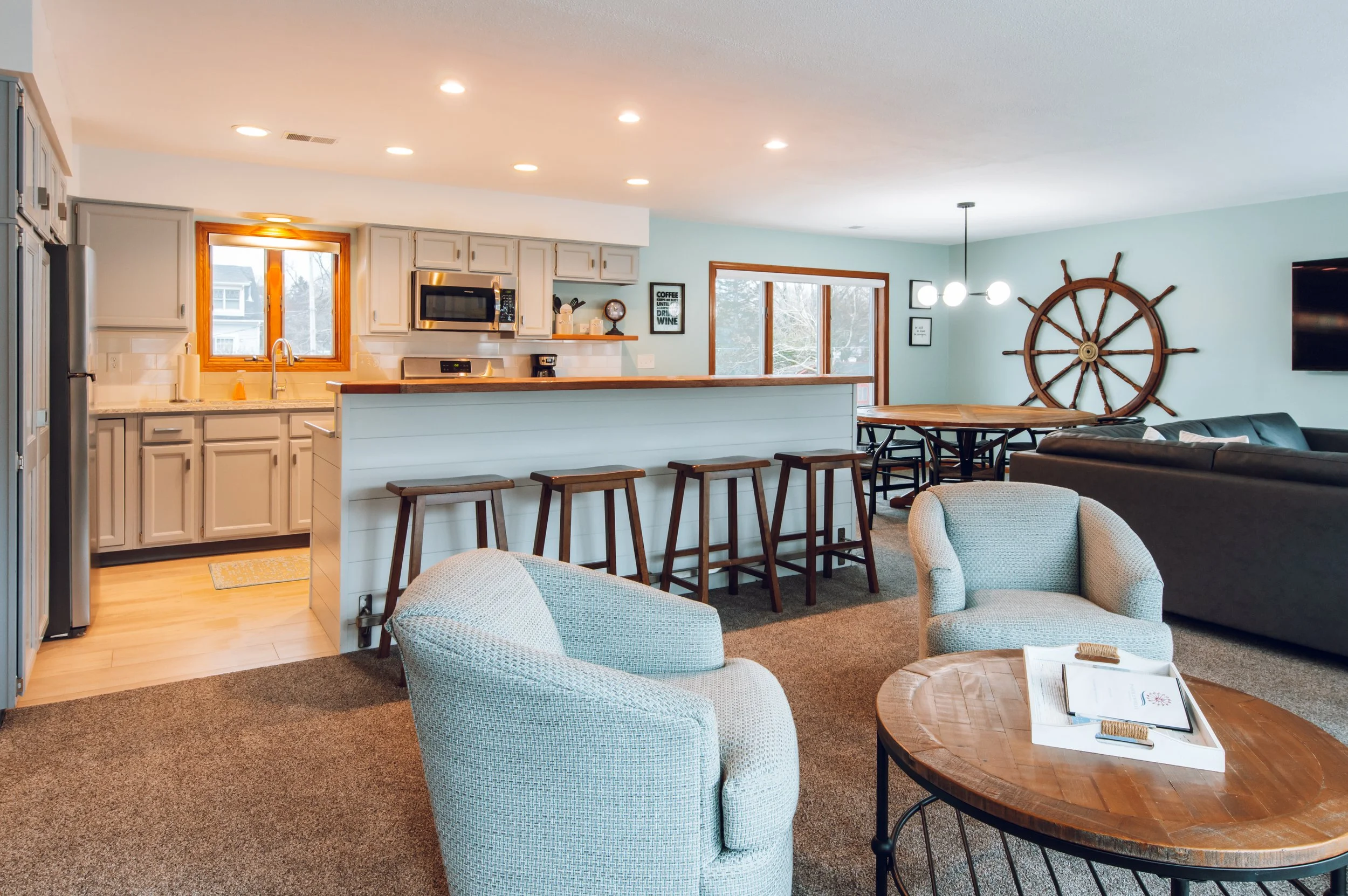 The third bedroom also has river views with a charming custom made bunk bed. The top bunk is a twin with landing space and the bottom is a queen bed. The mattresses are so comfy, you will want to take it home with you (please don’t try!). In the living/dining area you will enjoy a large space with the one of a kind views of the river, the boat launch, Mt. Baldhead and downtown Saugatuck. Full kitchen, island seating, dining table that seats 8, and a bonus upstairs reading room (and again, the views are just amazing).