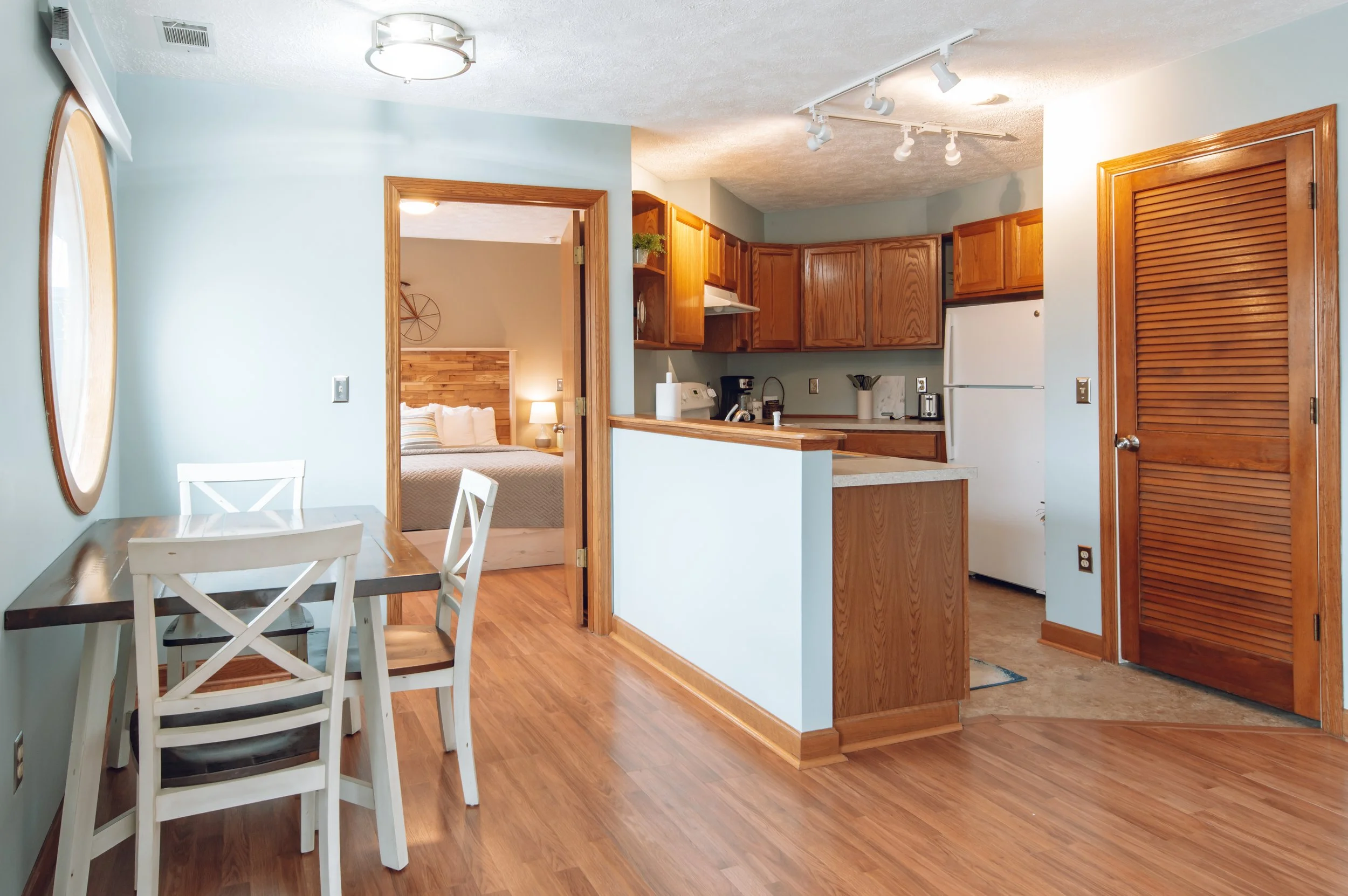 The original 716 condo was renovated a few years back. This is our only ground floor rental located within the Star of Saugatuck building. This spot is great for a weekend or week-long stay. Full kitchen, living room, dining space, bathroom with walk-in shower, all walking distance to everything Downtown Saugatuck. Enjoy a shared outdoor patio space private just for Paddlewheel guests! Great spot for relaxing, watching boat traffic, etc. The Red Door is perfect for those who want to walk to restaurants and shoppes but also be close to the river and Oval Beach.